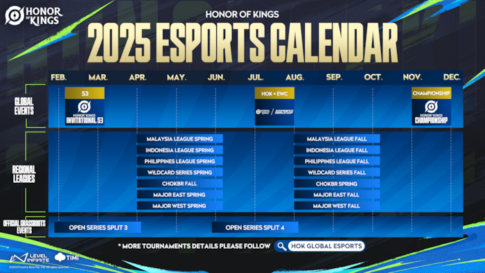 Honor of Kings ha annunciato il suo calendario Esports per il 2025, che copre tutti i settori dell'ecosistema, dai tornei regionali a quelli globali, dalle leghe professionistiche agli eventi di base per i giocatori che vogliono affinare le loro abilità. L'Honor of Kings Invitational Season 3 si terrà a febbraio e marzo 2025 nelle Filippine; ulteriori dettagli saranno presto svelati.