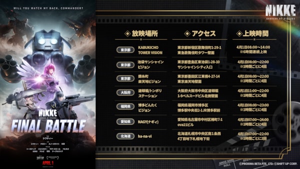 さらに、『勝利の女神: NIKKE』特別PV『FINAL BATTLE』の予告映像が全国各地で放映されることが決定いたしました!