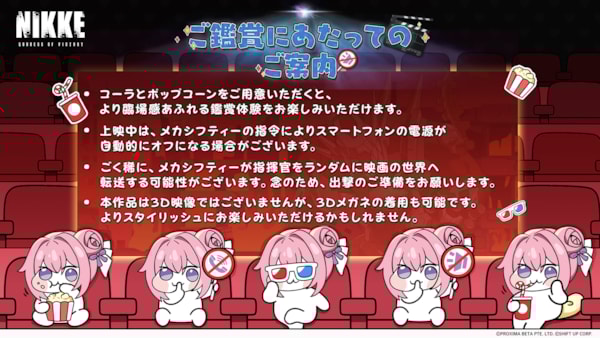 ポップコーンの持ち込み?座席での戦闘行為?シネマにおけるNIKKE流エチケットを、あなたも一緒に学びましょう。
