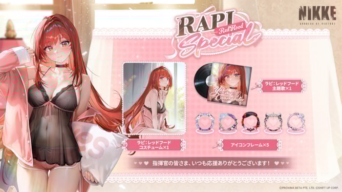 イベント:Rapi: Red Hood Specialで2025年のニケ人気投票で1位となったラピ:レッドフードのコスチューム「チェリッシュドレッド」を獲得できます。「チェリッシュドレッド」には、フルボイス、バーストスキルカットシーン、立ち絵ポーズ、SD特別モーションが含まれています。